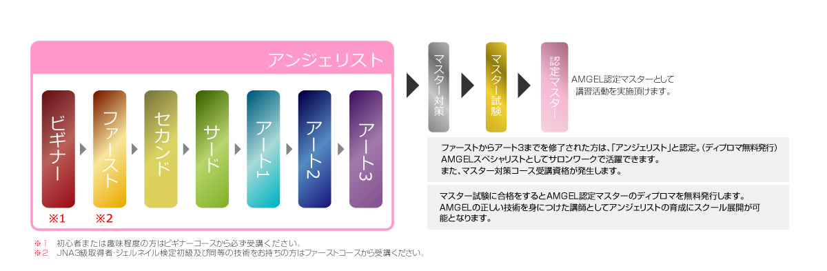 初心者からプロのネイリスト、AMGELに少し興味のある人や深く学びたい人まで、どなたにでもご参加いただける講習システムです。